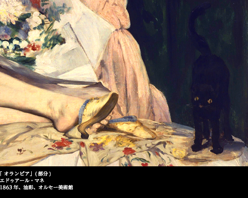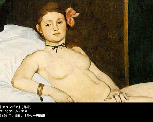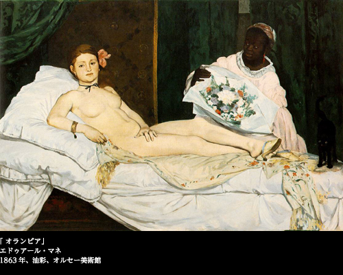 寝台に横たわる裸婦の構図は、言うまでもなく、ティツィアーノの「ウルビーノのヴィーナス」をもとにした「本歌どり」である。かの駘蕩たる美の構図を借りながら、マネは「本歌」がかろうじてまとっていたヴィーナスとしての「借り着」の残滓を、徹底して排し、現実社会の片隅に生きる生身の女を描いたのだった。日本の浮世絵の影響による、太い輪郭線と遠近法を無視した平面的画法が、西洋絵画の伝統に向けた挑戦状を旗幟鮮明にしている。