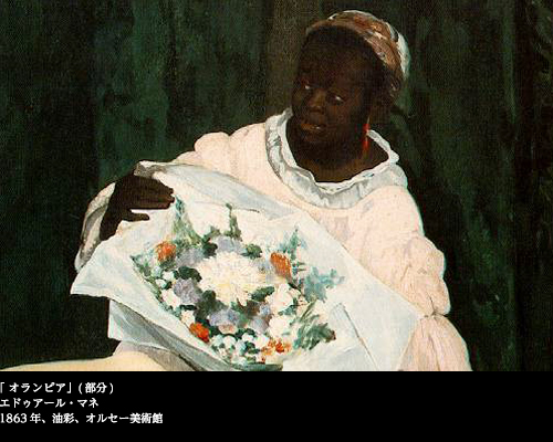もうひとつ、否応なく目立つのが、花束を手にベッドの脇に立つ黒人女性のメイドである。裸身の女性が小柄なせいもあって、大きさで言うとほぼ同じ、対等の存在感を示す。あるいは、裸婦と対になる存在なのだろうか?